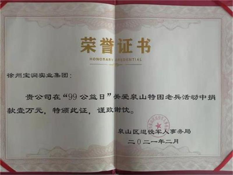 徐州寶潤實業集團積極圍繞市委、市政府中心工作,踐行社會主義核心價值觀,營造“人人參與、人人慈善”的良好生態環境,響應2020徐州市“99公益日”主題為“攜手慈善愛滿彭城”的活動號召,于“99公益日”當天的“關愛泉山特困老兵”活動中捐款一萬元整。