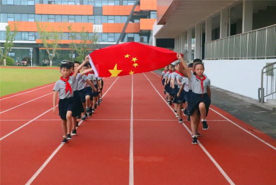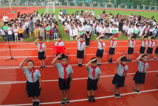 儀式開始,小國旗手們邁著整齊劃一的步伐,走到國旗臺前,伴隨著國歌響起,國旗緩緩升起。注目、敬禮,全體師生莊嚴肅立,感受這神圣的一刻。