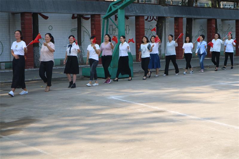 全校師生伴隨音樂(lè)節(jié)奏揮動(dòng)手中的小國(guó)旗,操場(chǎng)變成了紅色的海洋。