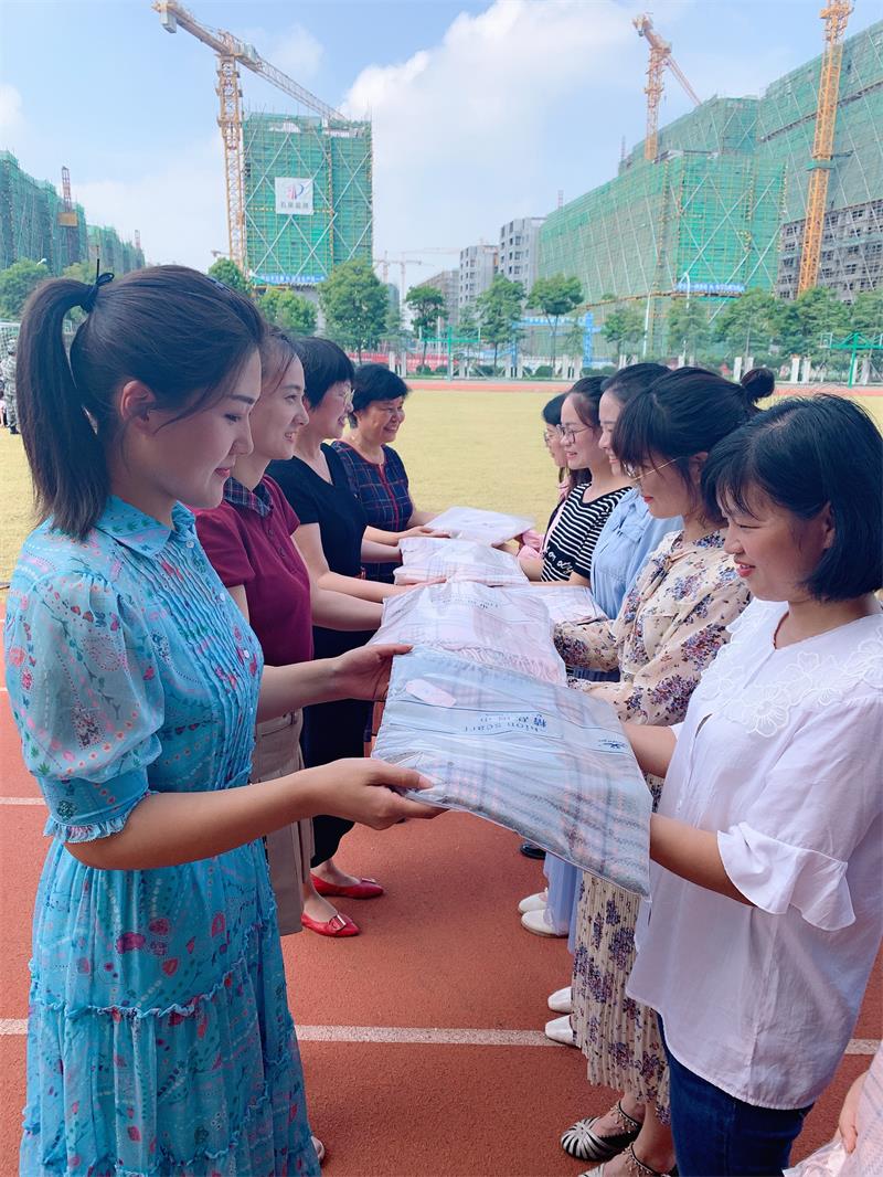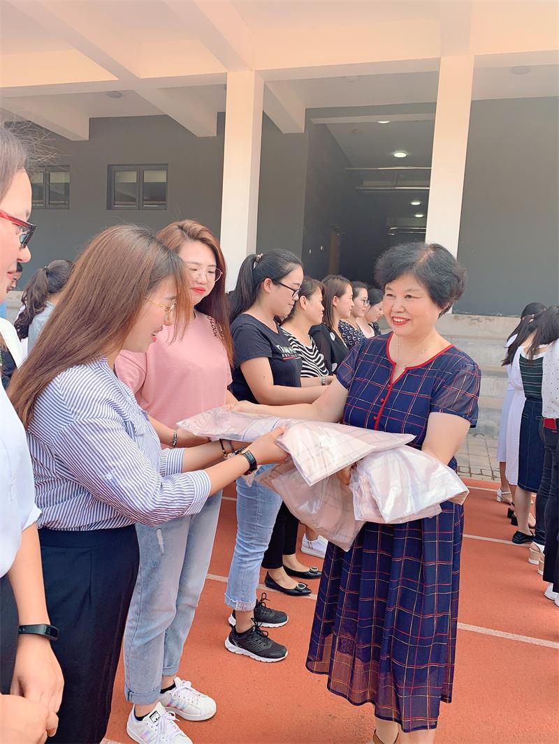 在高鐵校區,趙校長、張校長代表集團董事長把圍巾送給老師們