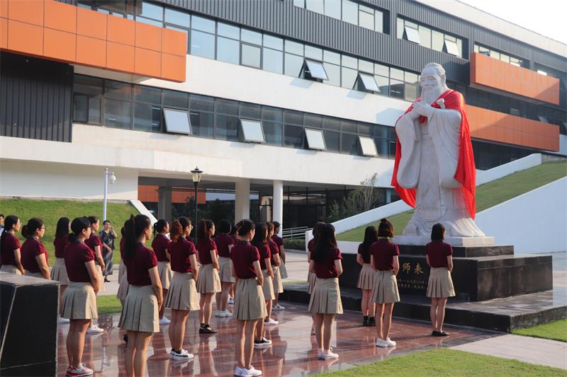 祭孔儀式在悠揚肅穆的古樂聲中開始。身著禮儀漢服的學生及眾祭者肅立于孔像前。首 先是教師代表向孔子像誦讀誓詞鞠躬行禮。孔子思想是中國傳統文化的主干,承繼孔子的教育思想(師齊)—-因材施教、教學相長、有教無類、溫故知新、學思并用,以萬代師表孔子為楷模,教書育人,做現代教育的踐行者、開拓者。讓我們懷著崇高的敬意,對我們的先師——孔子,致禮!