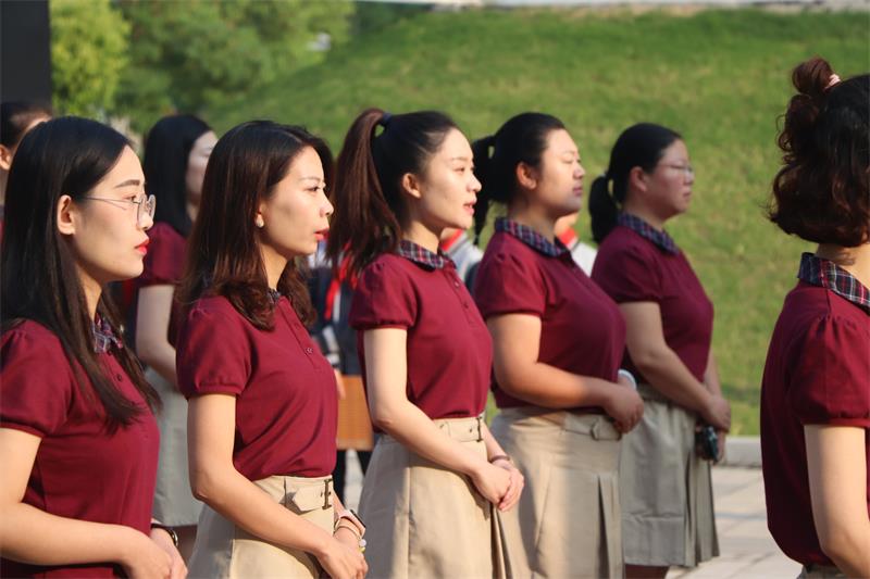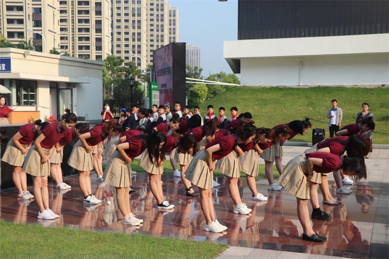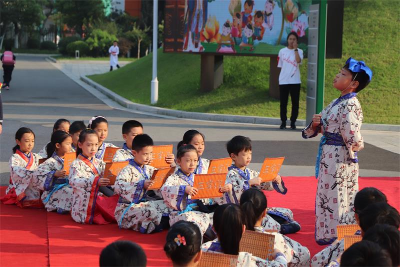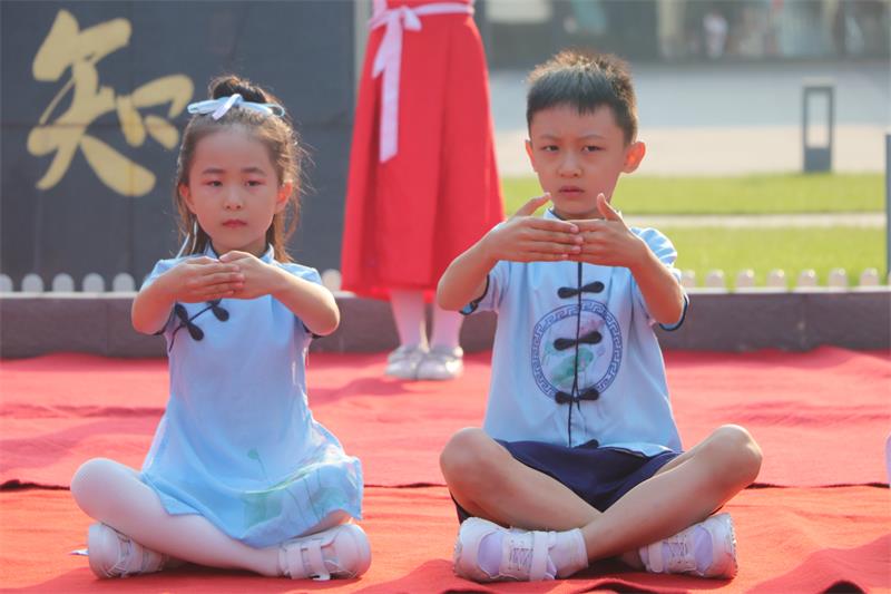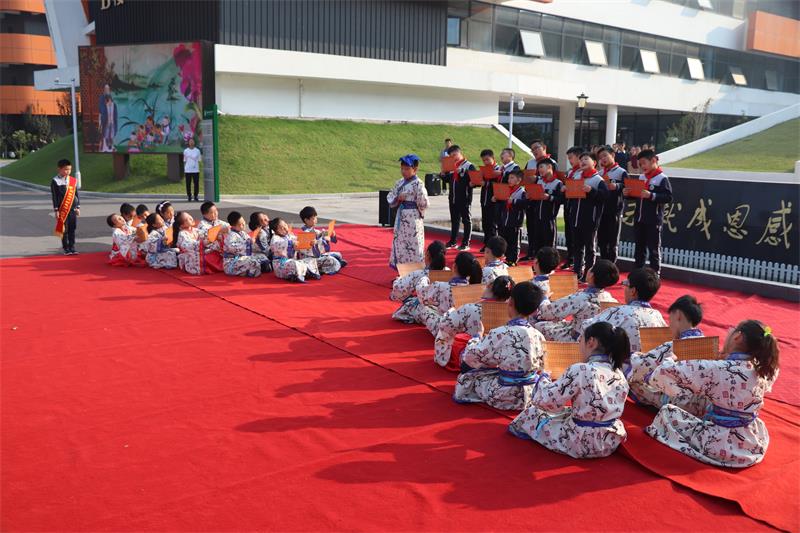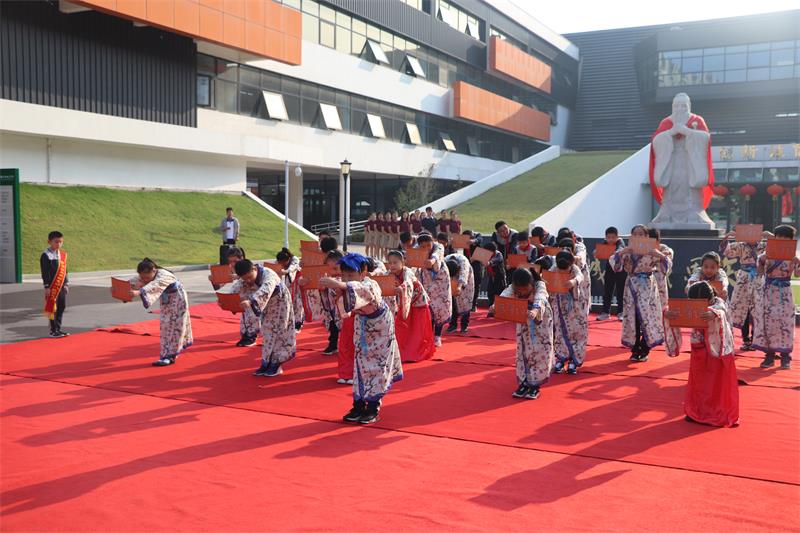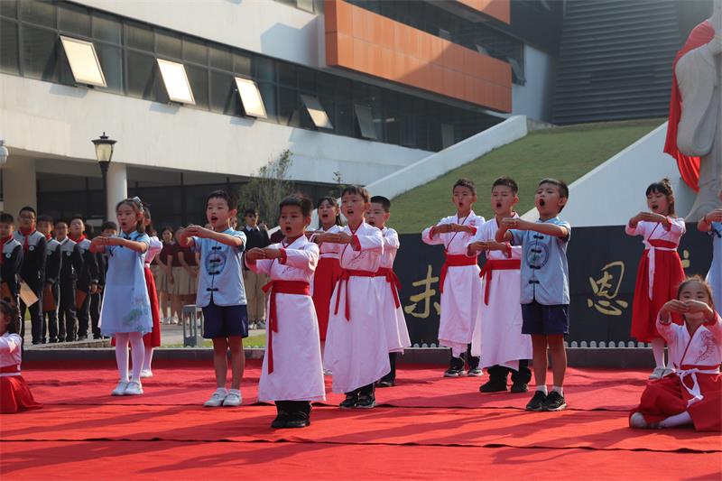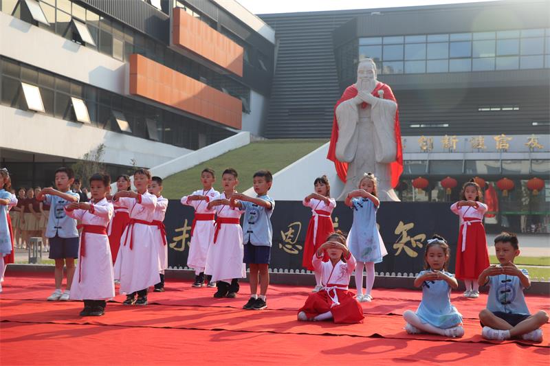 學生整齊站列身著漢服吟誦誓詞,向孔子像作揖行禮,誦讀誓詞。勵志成為謙虛謹慎、嚴格自省、品格高尚的樹恩人。而后,學生表演了《君子九思》《孔子爺爺》等節目。
