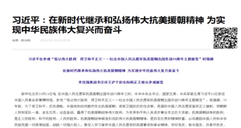 抗美援朝戰爭的勝利,是正義的勝利、和平的勝利、人民的勝利。我們要深入學習宣傳中國人民志愿軍的英雄事跡和革命精神,學好黨史、新中國史、改革開放史、社會主義發展史,激勵全黨全軍全國各族人民更加緊密地團結在黨中央周圍,牢記初心使命,堅定必勝信念,發揚斗爭精神,增強斗爭本領,為決勝全面建成小康社會、奪取新時代中國特色社會主義偉大勝利、實現中國夢強軍夢不懈奮斗,為維護世界和平、推動構建人類命運共同體作出更大貢獻。
